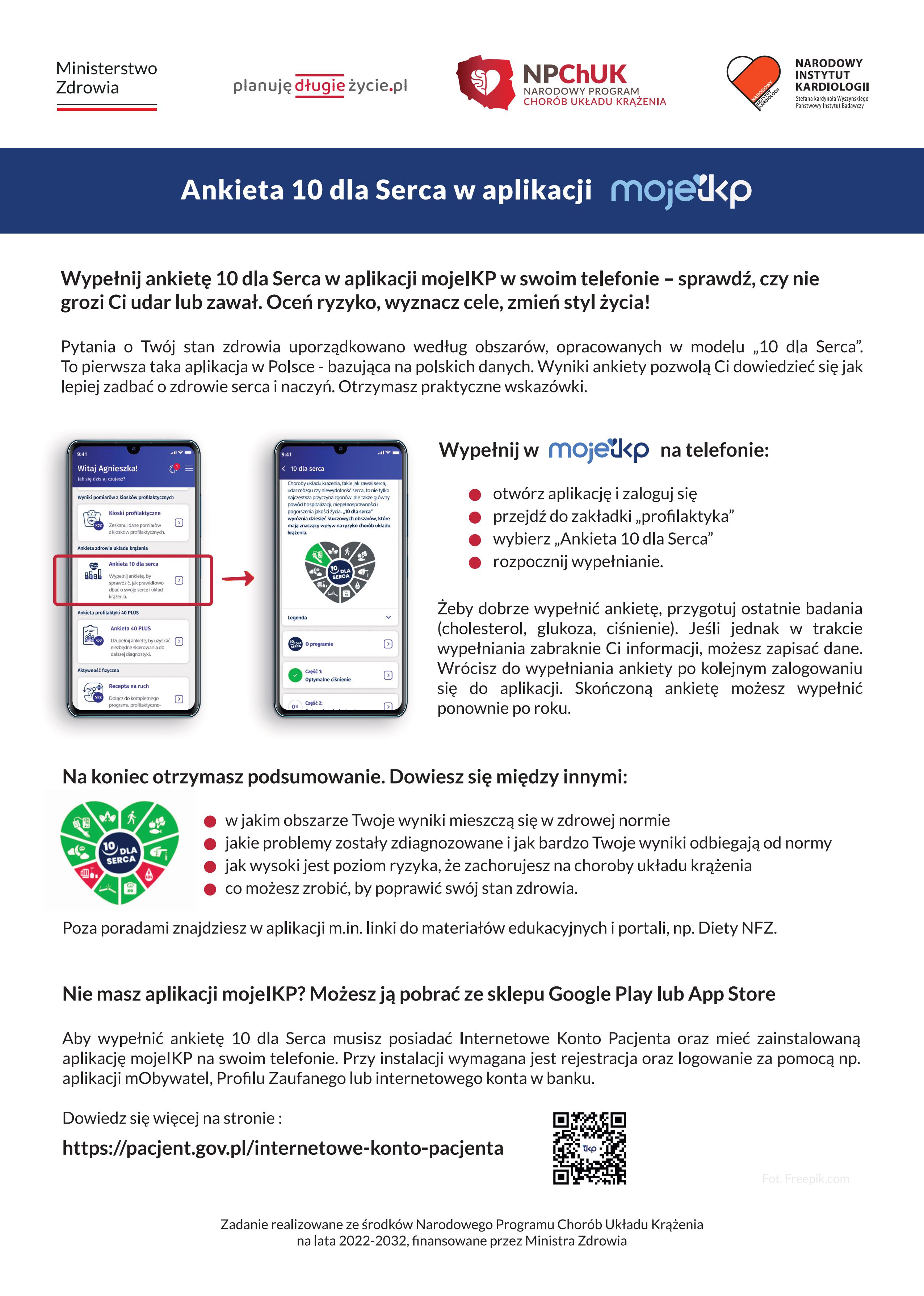 Uzupełnieniem działań jest ankieta „10 dla Serca” dostępna w aplikacji mojeIKP. Umożliwia wstępną ocenę indywidualnego ryzyka zdrowotnego. Wypełniając ją, dowiesz się, czy Twoje wyniki są na optymalnym poziomie i uzyskasz wskazówki, co robić, żeby poprawić swój stan zdrowia.