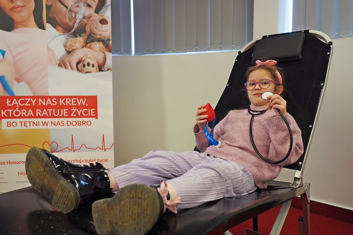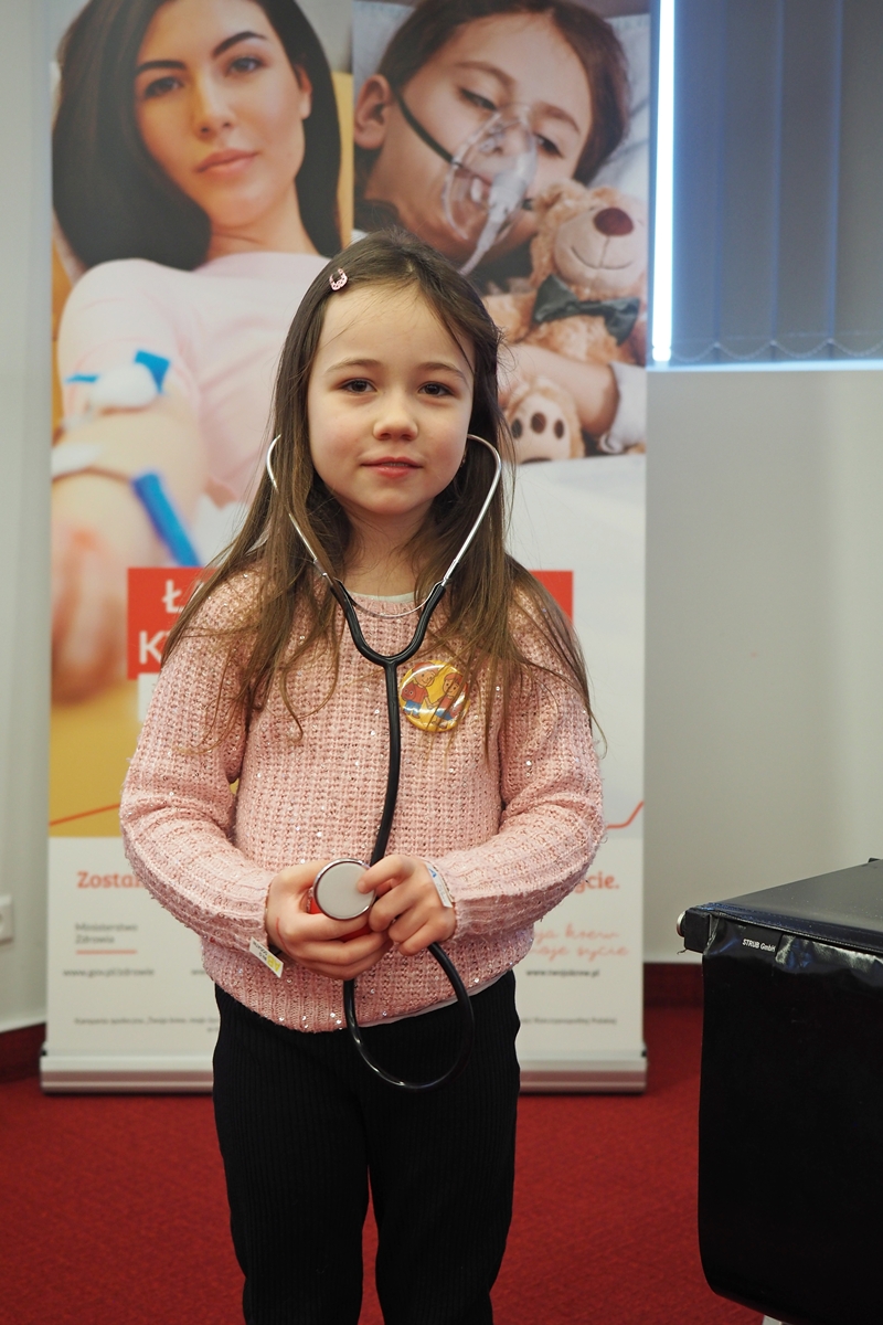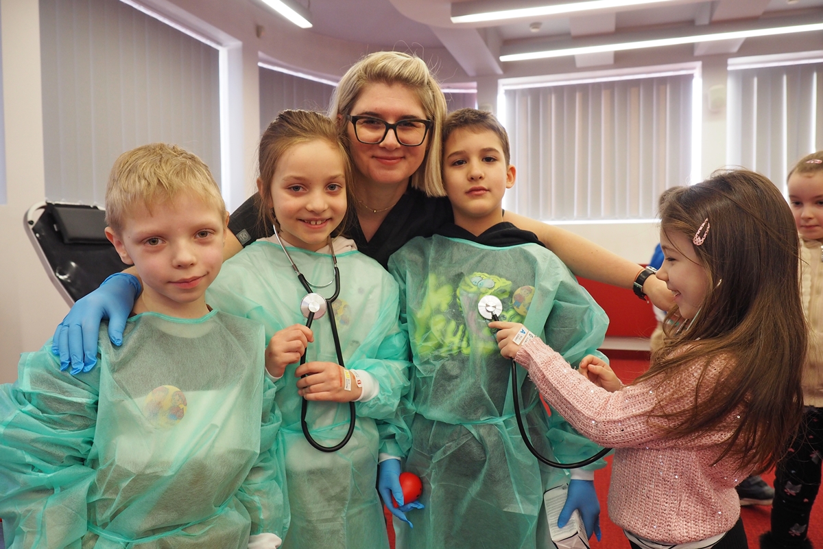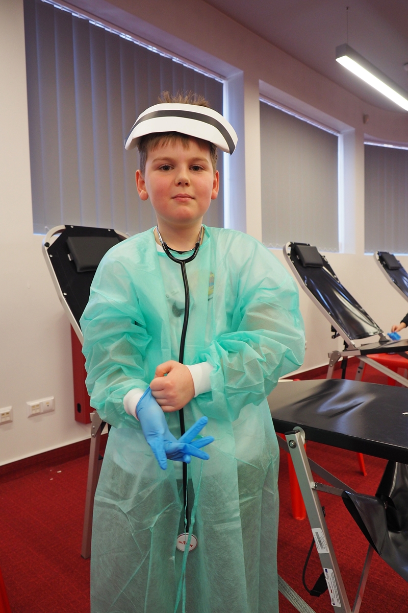 Na edukacji jednak świat się nie kończy. Mali goście mogli zajrzeć do strategicznych miejsc Centrum – działów administracyjnych, a także na własnej skórze zakosztować licznych atrakcji. Dzieci na chwilę wcieliły się w rolę Krwiodawców, zasiadając na fotelach do donacji, oraz w rolę lekarzy i pielęgniarek, przymierzając fartuch i czepek, słuchając bicia serca i pozwalając się osłuchać.